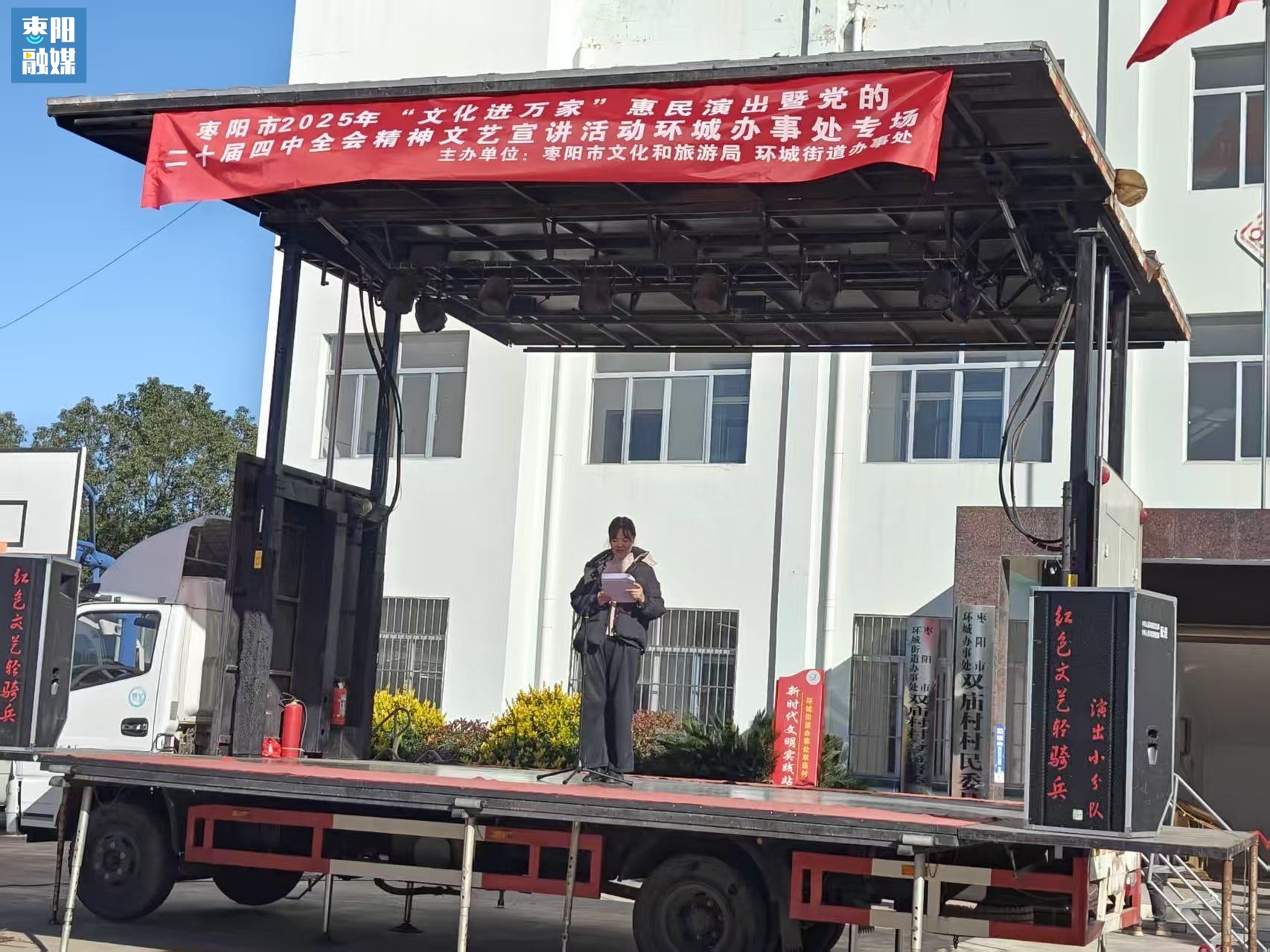11月25日,枣阳市2025年“文化进万家”惠民演出暨党的二十届四中全会精神文艺宣讲活动在环城街道办事处双庙村举行。活动集非遗展示、文艺演出、图书下乡与政策宣讲于一体,为当地村民献上了一场精彩纷呈的文化盛宴,让党的创新理论和优秀文化成果“飞入寻常百姓家”。