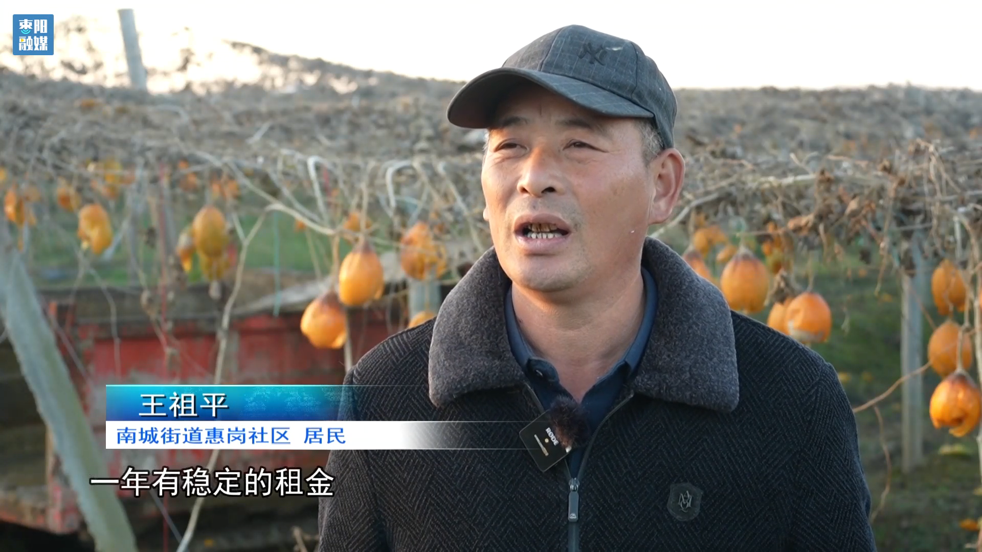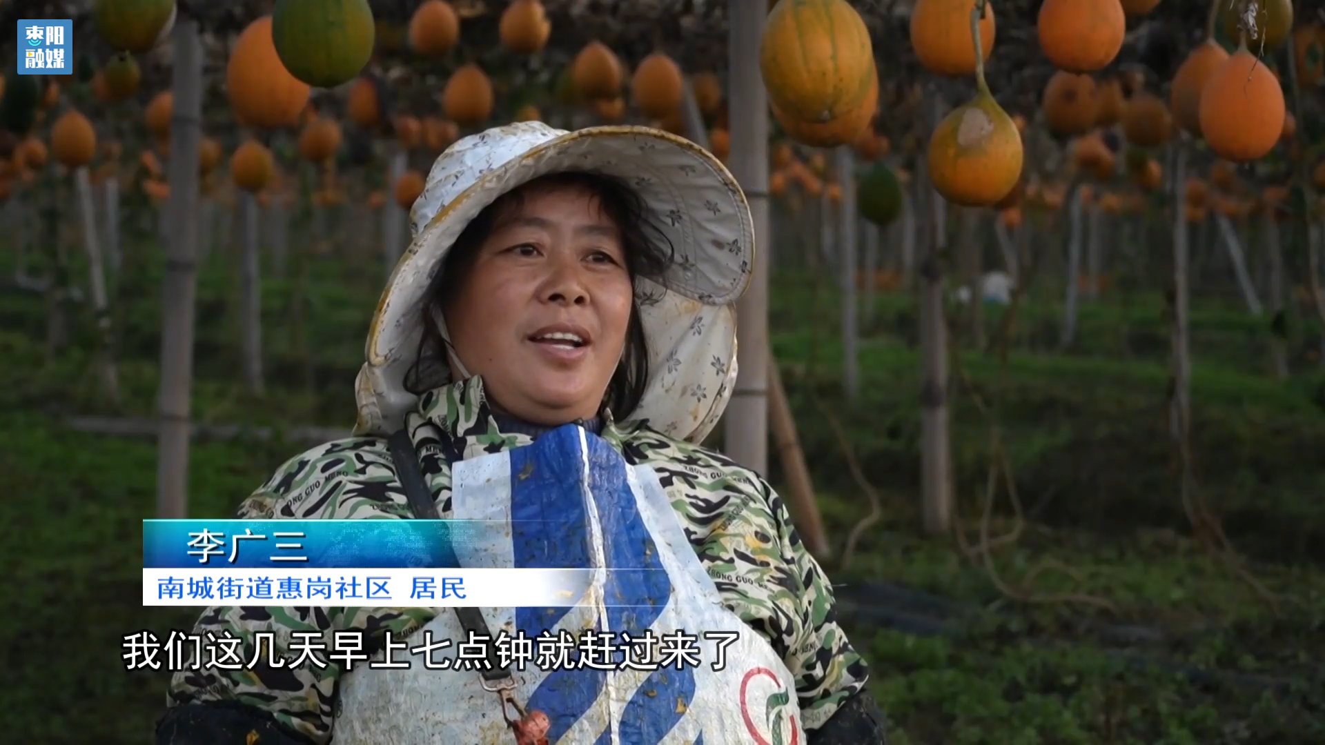 南城街道惠岗社区党委书记、居委会主任何庆功:经过协商,我们村(社区)集体出面,统一从农户(居民)手里流转土地,再统一规划、引进品种、寻找销路,把风险扛在肩上,把机遇留给村(居)民。现在这个吊瓜亩产值能达到5000元,村(居)民租金、工资两不愁。