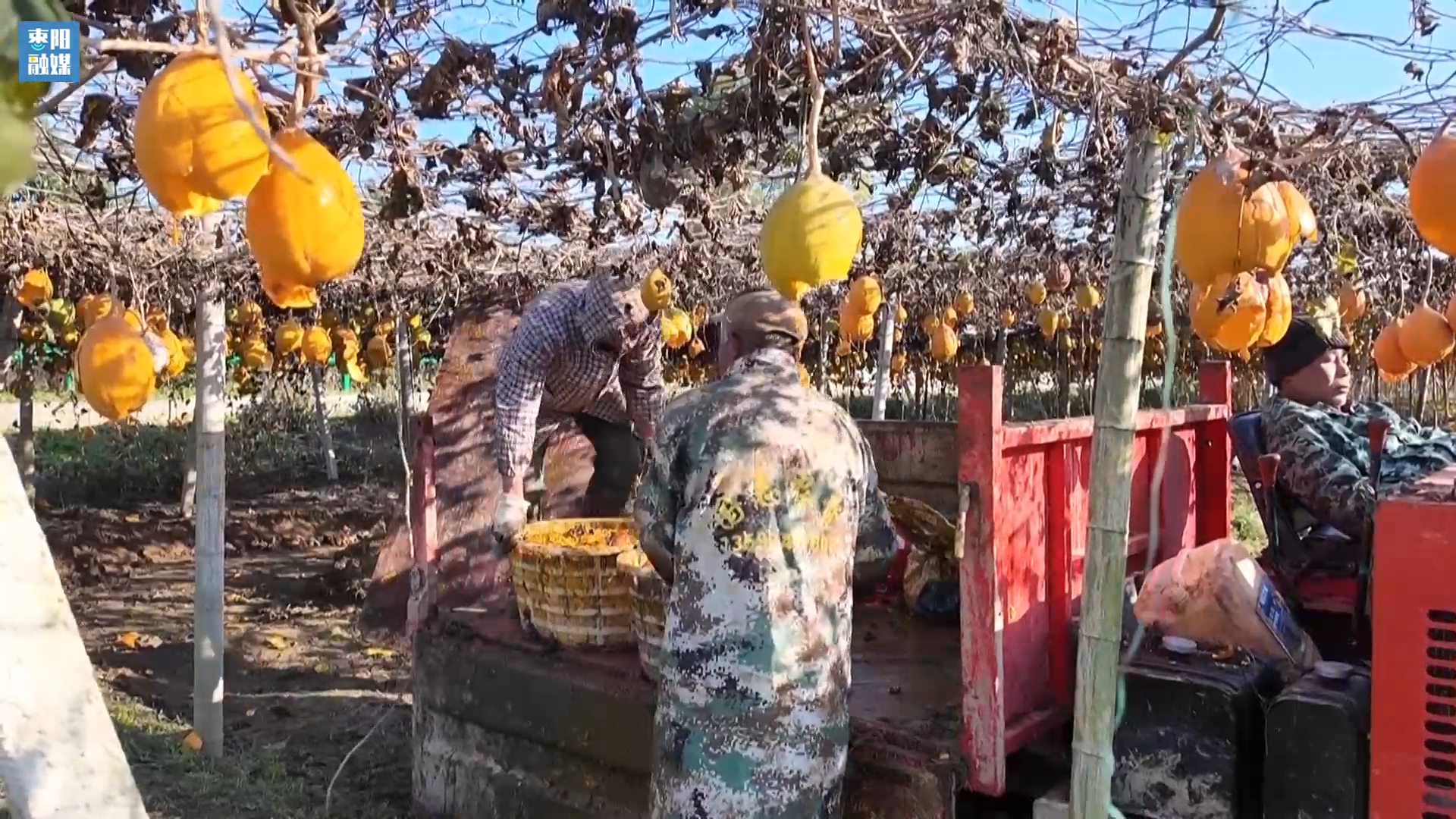 初冬时节,惠岗社区800亩吊瓜迎来大丰收。在冬日暖阳下,金黄的吊瓜如盏盏灯笼般缀满藤架,映照着居民们忙碌采摘、装筐、搬运吊瓜的身影。