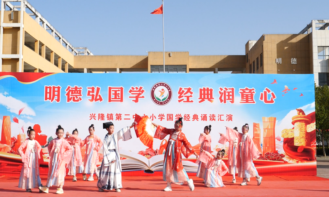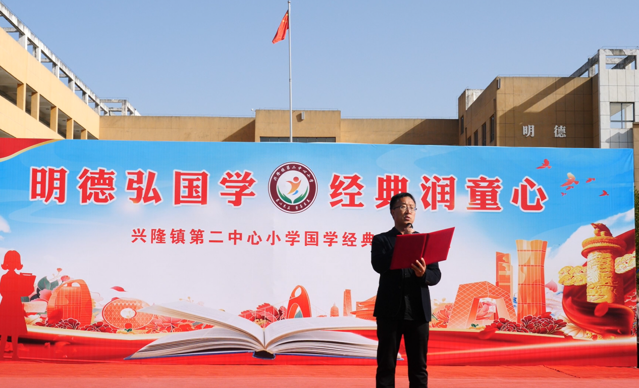 活动伊始,兴隆镇第二中心小学书记张道毅致词,学校始终将国学教育融入日常教学,通过经典诵读、国学讲堂等系列活动,让学生在“腹有诗书气自华”的熏陶中,感受中华优秀传统文化魅力,培养良好道德品质与人文素养。希望孩子们在今天这个舞台上,用最真挚的声音,传承千年文脉,唤醒文化记忆,绽放属于这个时代的经典光华。