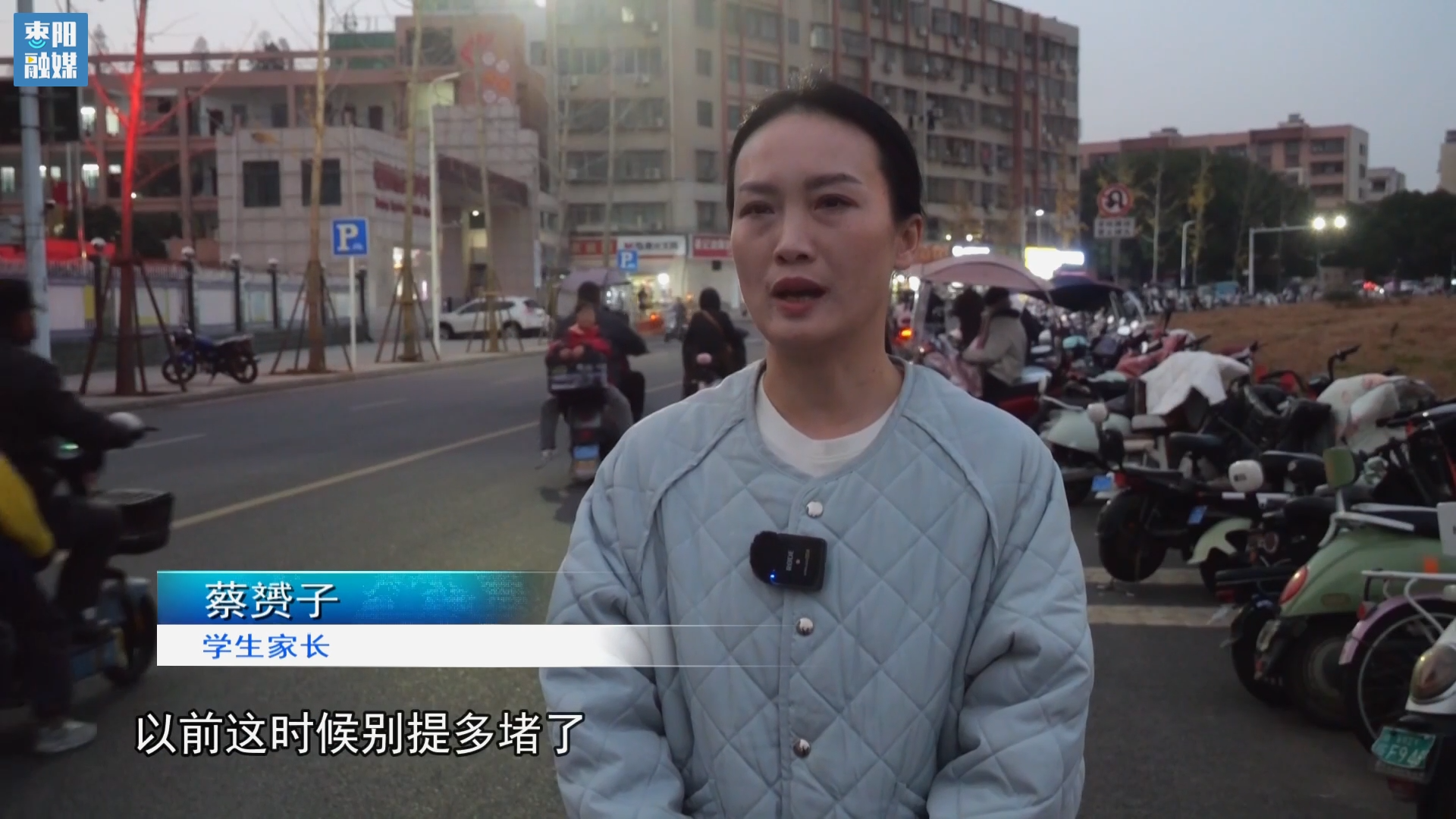 学生家长蔡赟子:以前这时候别提多堵了,摊贩都摆到马路中间,电动车、接送车挤在一起,孩子上学得提前半小时出门,还担心安全。现在划了专门的经营区,路宽了,心里也踏实了!
