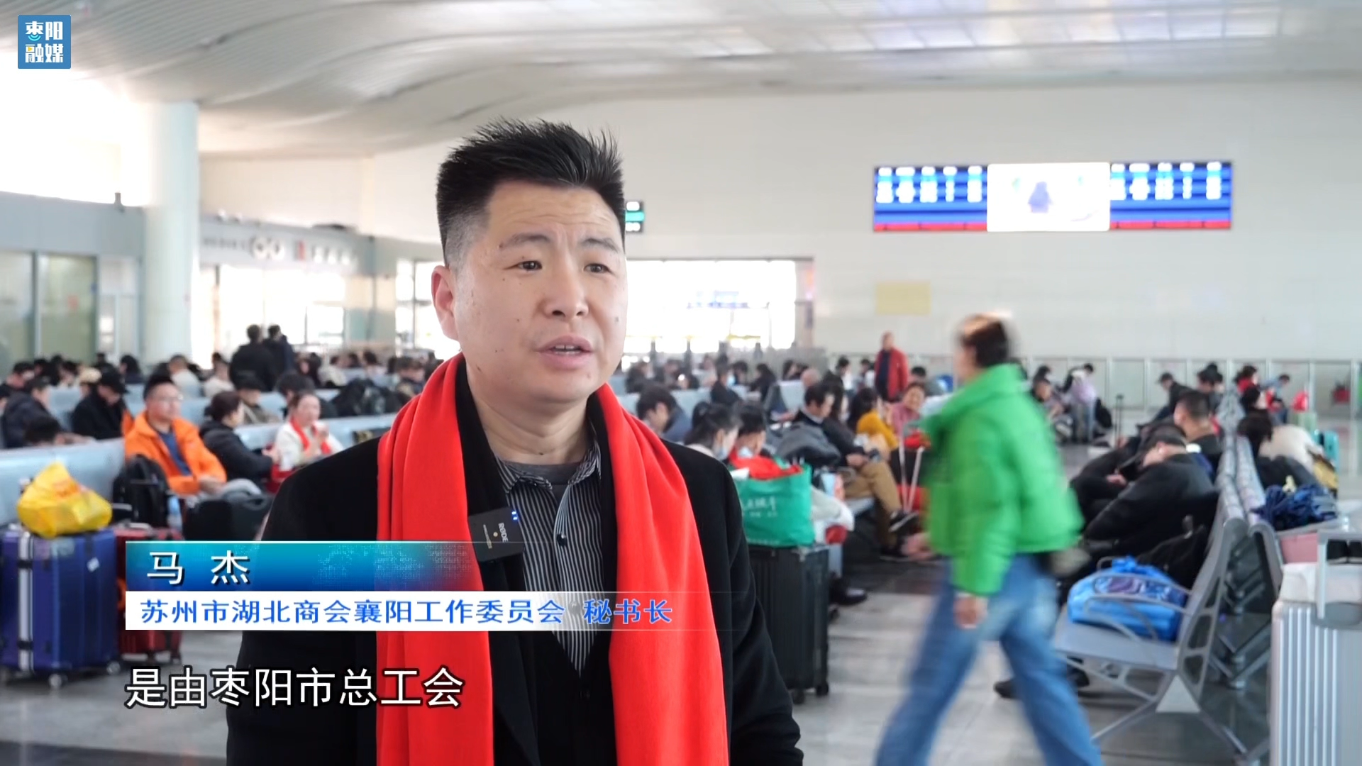 苏州市湖北商会襄阳工作委员会秘书长马杰:免费回乡公益专列,是由枣阳市总工会联合苏州市襄阳商会共同发起,旨在为在外务工人员解决春运期间购票难的痛点,感谢枣阳市总工会对我们在外务工人员的关心和关爱。