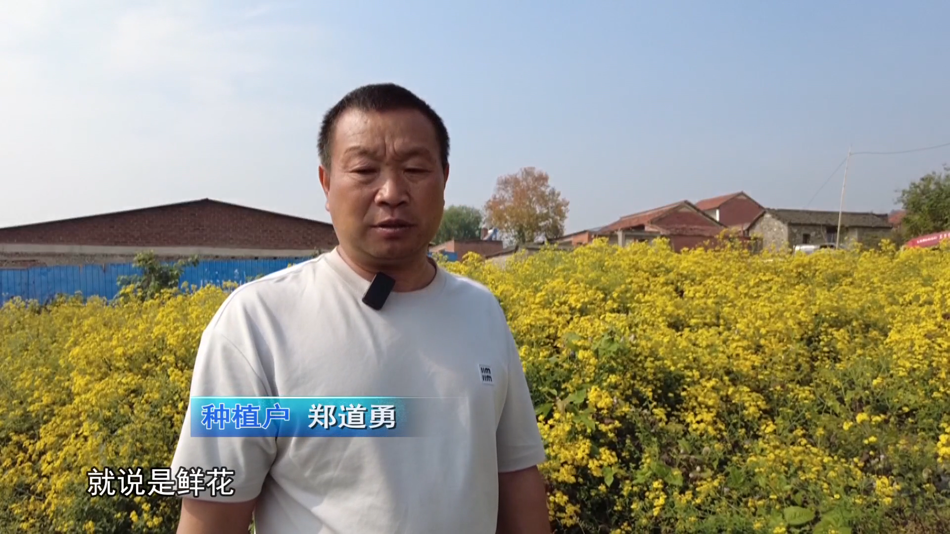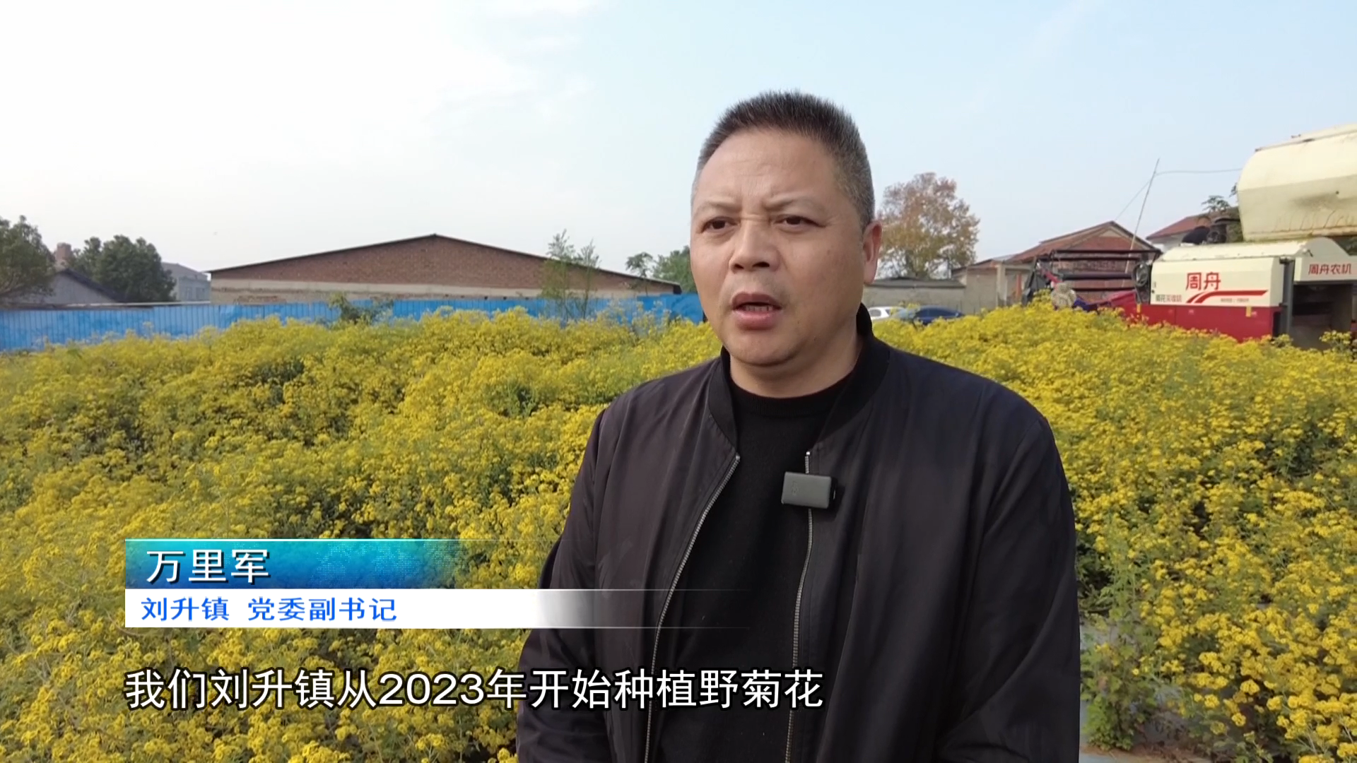 刘升镇党委副书记万里军:我们刘升镇从2023年开始种植野菊花,目前全镇种植面积达到5,000亩左右。我们刘升的野菊花,经过药效测量,蒙花苷含量非常高。目前我们和这个华润三九公司这个联合种植,采取公司+农户+合作社的方式,这个花杆统一收购,每斤0.7元,每亩可带动农户增收3,500元,全镇有500户参与这个野菊花种植。