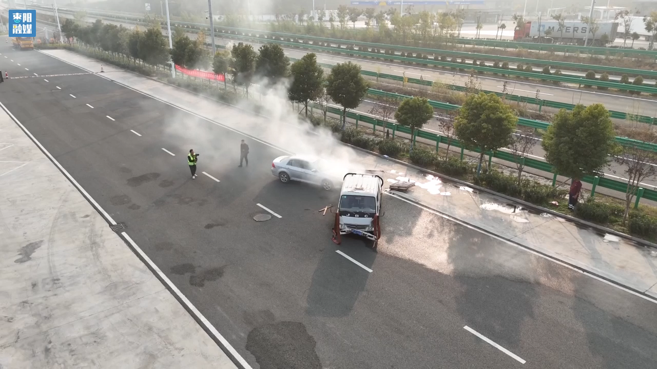 此次演练模拟枣潜高速潜江方向K2处发生两车追尾起火事故,货车车门变形,导致1名司乘人员被困车内,事故造成高速道路中断。