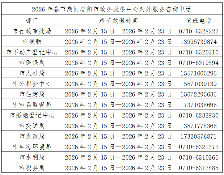 附件:2026年春节期间枣阳市政务服务中心对外服务咨询电话