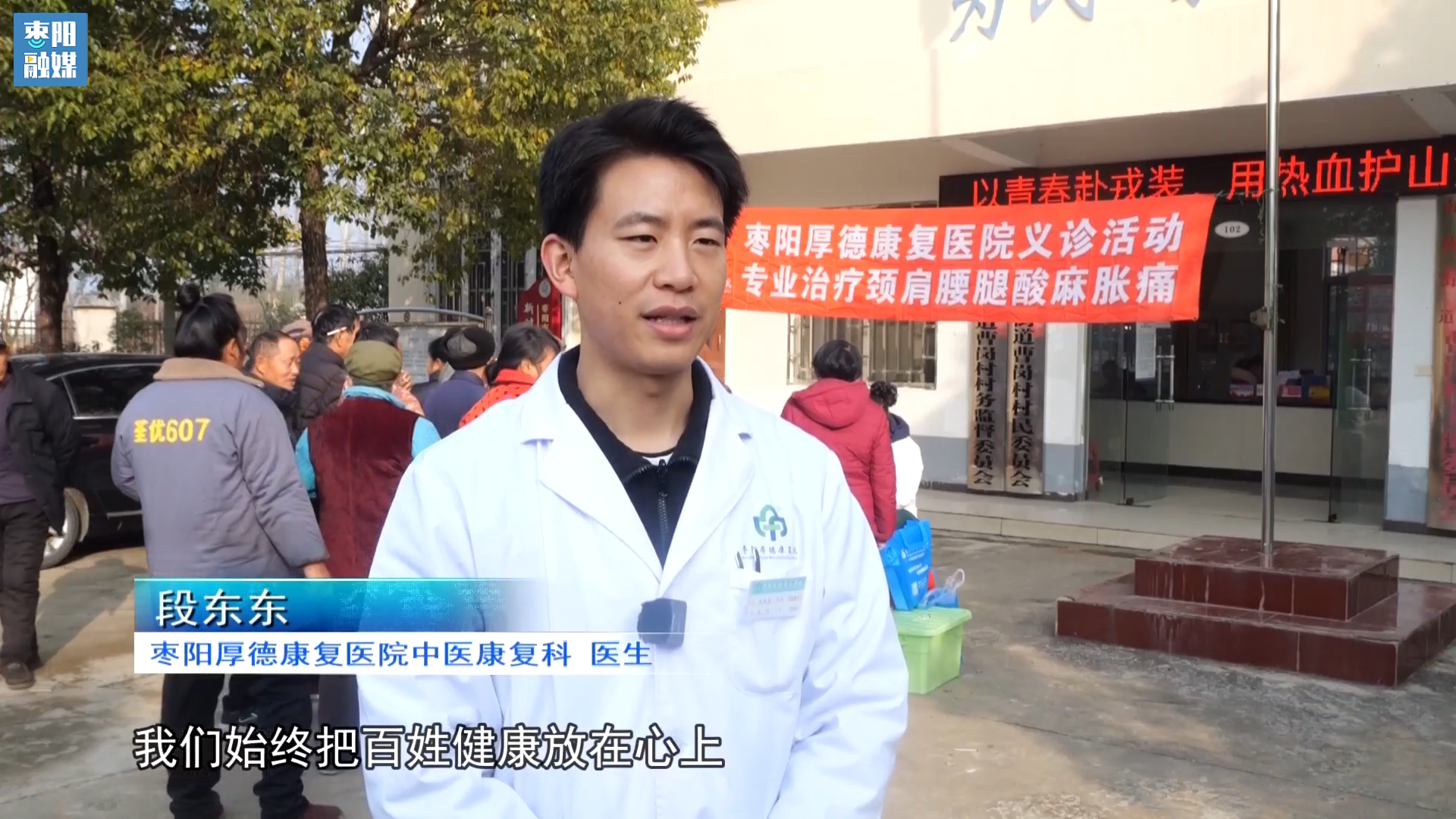 枣阳厚德康复医院中医康复科医生段东东:我们始终把百姓健康放在心上,用实际行动助力健康帮扶。未来,我们也会继续发挥中医特色优势,多开展这样的公益活动,把温暖和关怀送到大家身边。