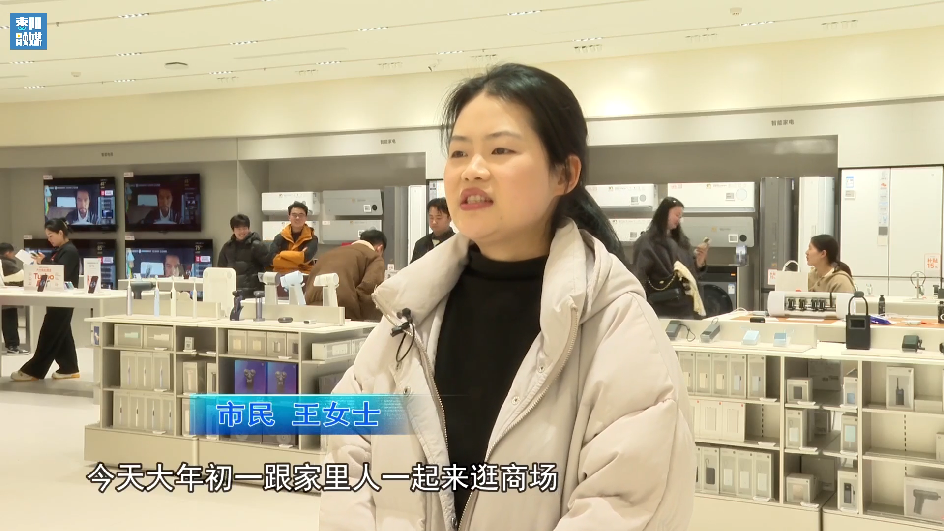 市民王女士:今天大年初一跟家里人一起来逛商场,想给我爸换一台手机,原价是3499(元)的,现在优惠完国补和汇聚广场的补贴之后只要2805(元),优惠了将近700块钱,优惠力度还是蛮大的。