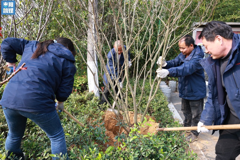 活动在中兴公园西侧景观带及公园月季花廊举行。现场大家分工协作、挥锹铲土、扶苗围堰、浇水培土,一派热火朝天的劳动景象。劳模先进率先垂范,职工代表踊跃参与,一株株新苗迎风挺立,为初春枣阳增添勃勃生机。
