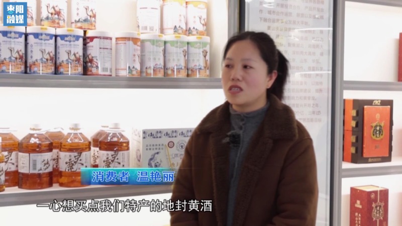 消费者 温艳丽:朋友来枣阳玩,一心想买点我们这个特产的地封黄酒,因为鹿头黄酒比较出名,所以说走了想给他们带点。