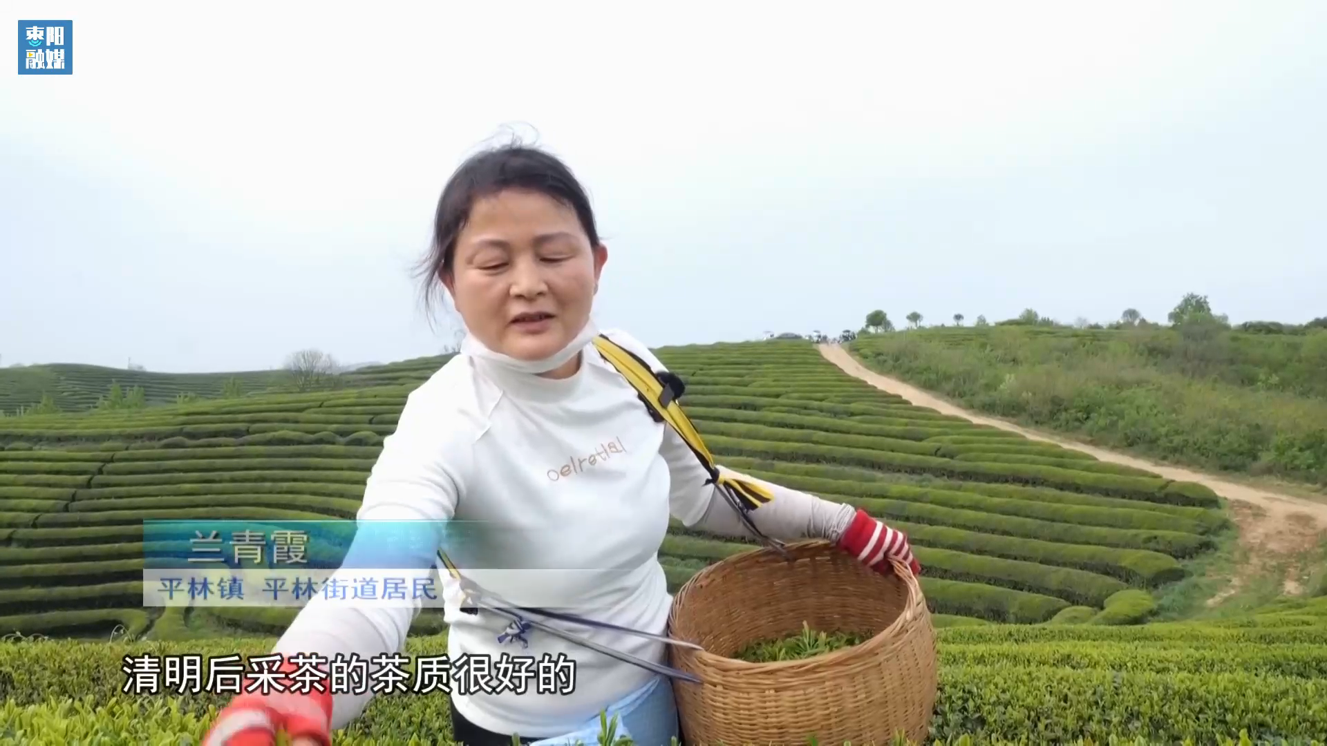 平林镇平林街道居民兰青霞:清明后,采茶的品质很好的,一天能采个十来斤,挣一百多块钱,我预计采茶结束能挣个三四千块钱。