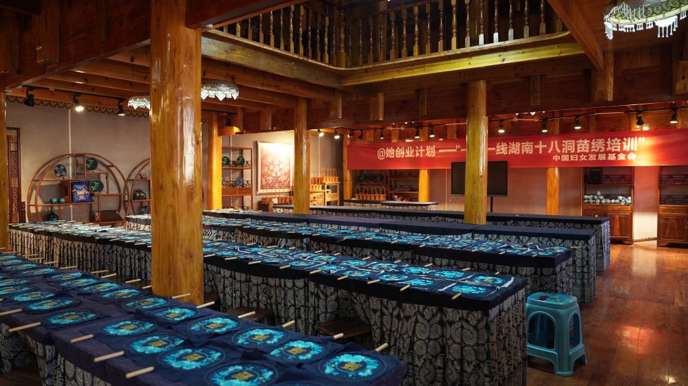 她所在的马鞍村“十八洞片区苗绣乡村振兴示范基地”采取“合作社+公司”模式,将传统纹样融入现代审美,开发了服饰、文创等各类产品。近年来,基地又与故宫博物院及网络红人等合作,积极开拓北美、非洲销售渠道,带动周边562名和吴满金一样的苗族妇女实现“带着娃、绣着花,养活自己又养家”。