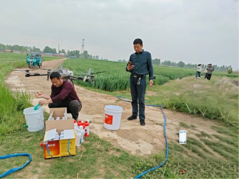 近日,在鹿头镇武岗村三组的麦田边,枣阳市谷丰源农业有限公司的工作人员将杀菌剂、杀虫剂、生长调节剂按比例调配后倒入无人机药箱,随即,由无人机机手操控,按既定线路飞到麦田上方均匀喷药。