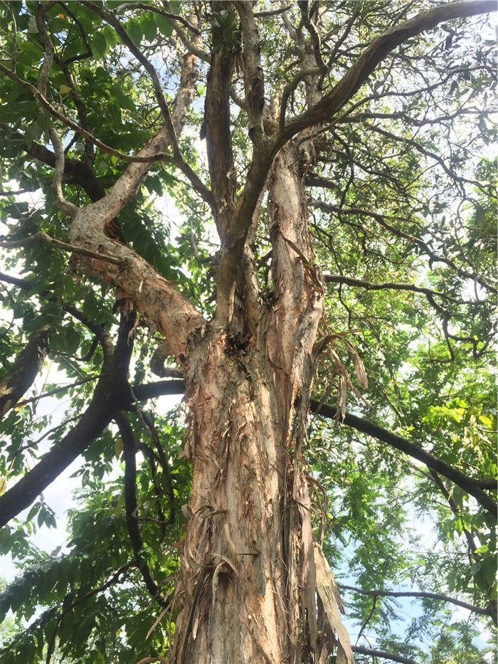 白千层是常见的行道树,它的树皮层层叠叠、参差不齐:每年新长的树皮把老树皮推挤出来,老皮就一层贴一层留在树干上。白千层能吸收汽车尾气,本应白皙的树皮总显得脏兮兮,加上树干歪斜扭曲,白千层看起来并不美观。